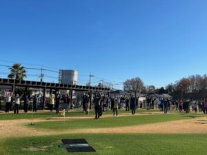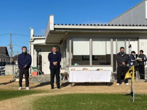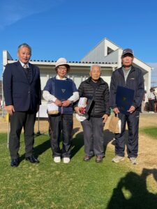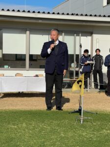 開会式は山入端市長の挨拶で始まり、今年最後となる大会に大勢のご参加いただいたことに感謝されました。前回もお話ししましたが、道の駅に、食肉販売施設が、12/21(日)にOPENしますので、皆様も是非ご利用下さい。また、羽曳野市としての物価高騰対策を近日中に発表いたしますのでご期待くださいとおっしゃられました。すばらしい天候に恵まれましたので、スコアもすばらしいものなることを祈念し締めくくられました。